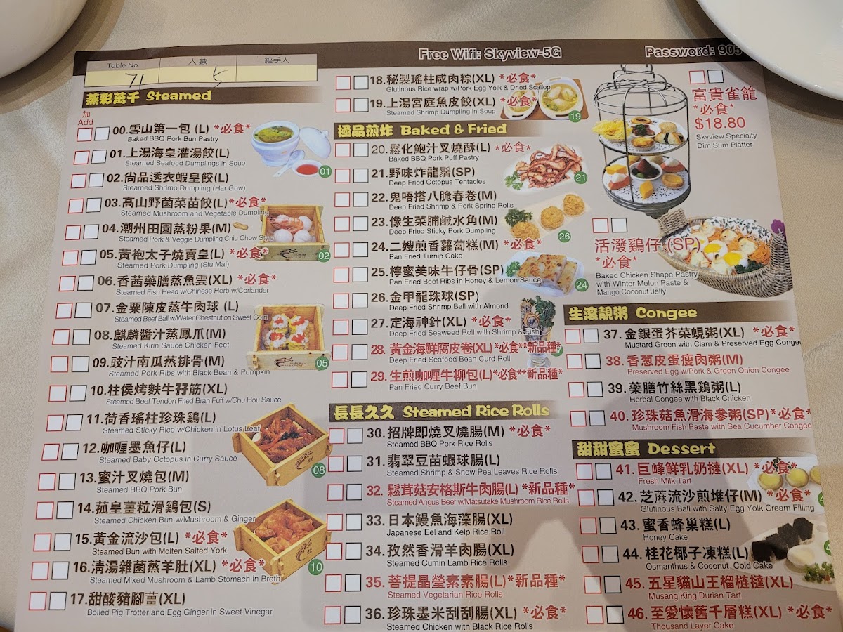 We visited Skyview Fusion Cuisine for dim sum at 2 PM on a Monday, and it was still bustling—proof of how popular this place is! The dim sum was excellent, with a wide selection that we ordered from a sheet menu. The food was fresh, flavorful, and beautifully presented. Standouts for us were the egg tarts, BBQ pork buns, and the short ribs. Despite the crowd, the service was quick and attentive, which made the experience even better. The ambiance and table settings were elegant, and the whole experience felt special. Whether you’re a dim sum fan or trying it for the first time, I’d highly recommend Skyview Fusion Cuisine! (See the attached photos for some of the dishes we tried—they were as delicious as they look!)