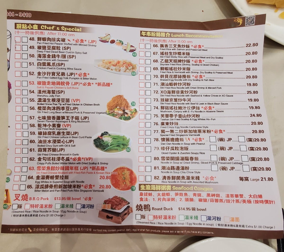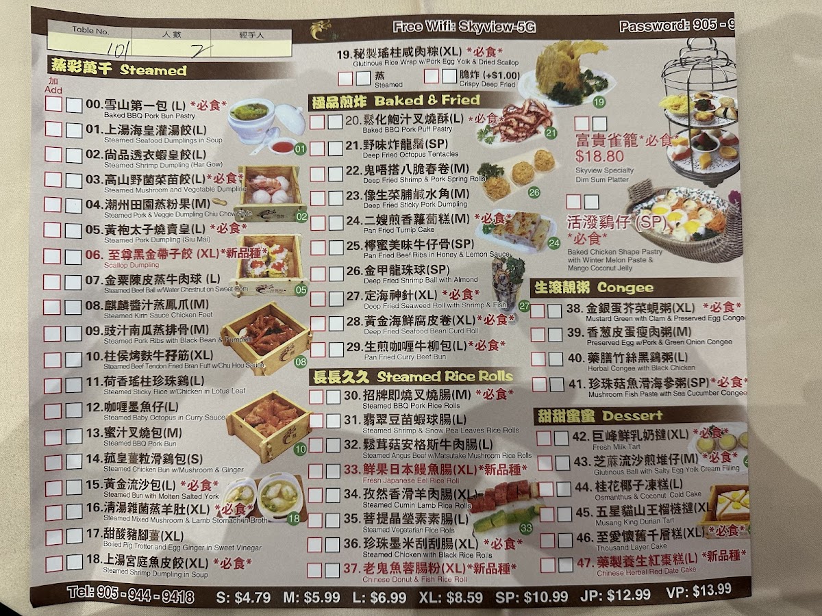 Skyview Fusion Cuisine is hands-down one of the best dim sum spots in Markham! Though there was a 1-hour wait, the experience was well worth it. Skyview Specialty Dim Sum Platter (20.90): This beautifully presented dish stole the show. Served in an elegant cage, it included an assortment of egg tarts, BBQ pork buns, mango and papaya jellies, mung bean pastries, and oranges for a festive touch. Each item was well-made and delicious. Baked BBQ Pork Bun Pastry: A must-try! The flaky, crispy exterior pairs perfectly with the savory-sweet BBQ pork filling. Deep-Fried Seafood Bean Curd Roll: Packed with shrimp and other seafood, these rolls were crispy and flavorful. Perfect for seafood lovers! Clam & Preserved Egg Congee: Light, silky, and comforting. The clams added a fresh, briny touch, and the congee paired beautifully with the richer dim sum dishes. Musang King Durian Tart: If you’re a fan of durian, this tart is a must. The buttery crust and rich, creamy filling were indulgent and satisfying. The average spend is 25 per person, and portions are generous. The interior is spacious with a lively vibe, making it great for family gatherings or weekend brunches. Pro tip: Arrive early, grab a ticket, and head to Costco next door while you wait! A fantastic spot for authentic dim sum with a modern touch. Highly recommended!